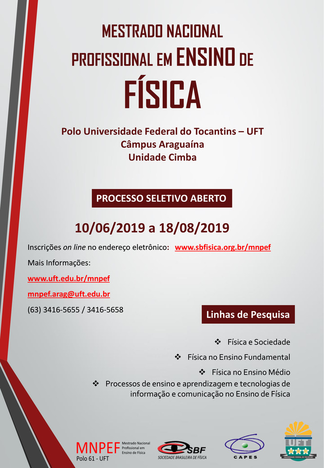 O Mestrado Nacional Profissional em Ensino de Física (MNPEF) promove nos dias 13, 14 e 21 de agosto, no Câmpus de Araguaína, o IV Workshop em Ensino de Física do Tocantins (WEFTO), e abre as inscrições e chamada para submissões de trabalhos. O evento contará com palestra de abertura, minipalestras, apresentações de banners e oficina.
