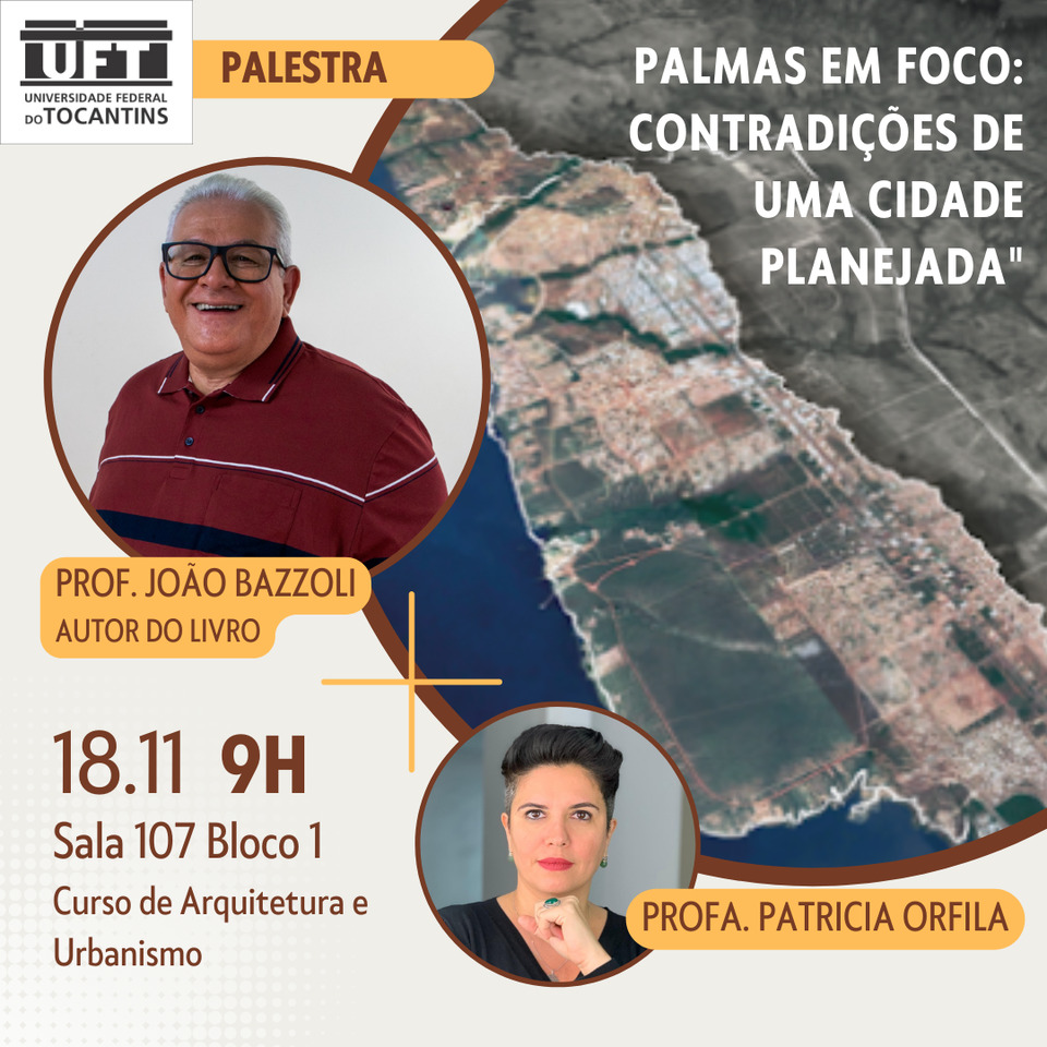 Com o objetivo de debater o planejamento da cidade de Palmas, com o professor João Bazzoli, autor da obra Palmas em foco: as contradições de uma cidade planejada, publicada em 2019, será realizada uma palestra no próximo dia 18 de novembro, às 9h, na Sala 107, Bloco I, do Câmpus de Palmas, da Universidade Federal do Tocantins (UFT).