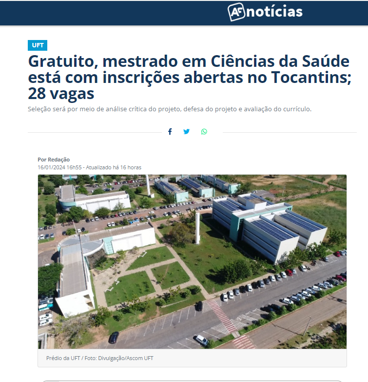 Matéria disponível: https://afnoticias.com.br/concursos-e-oportunidades/gratuito-mestrado-em-ciencias-da-saude-esta-com-inscricoes-abertas-no-tocantins-28-vagas