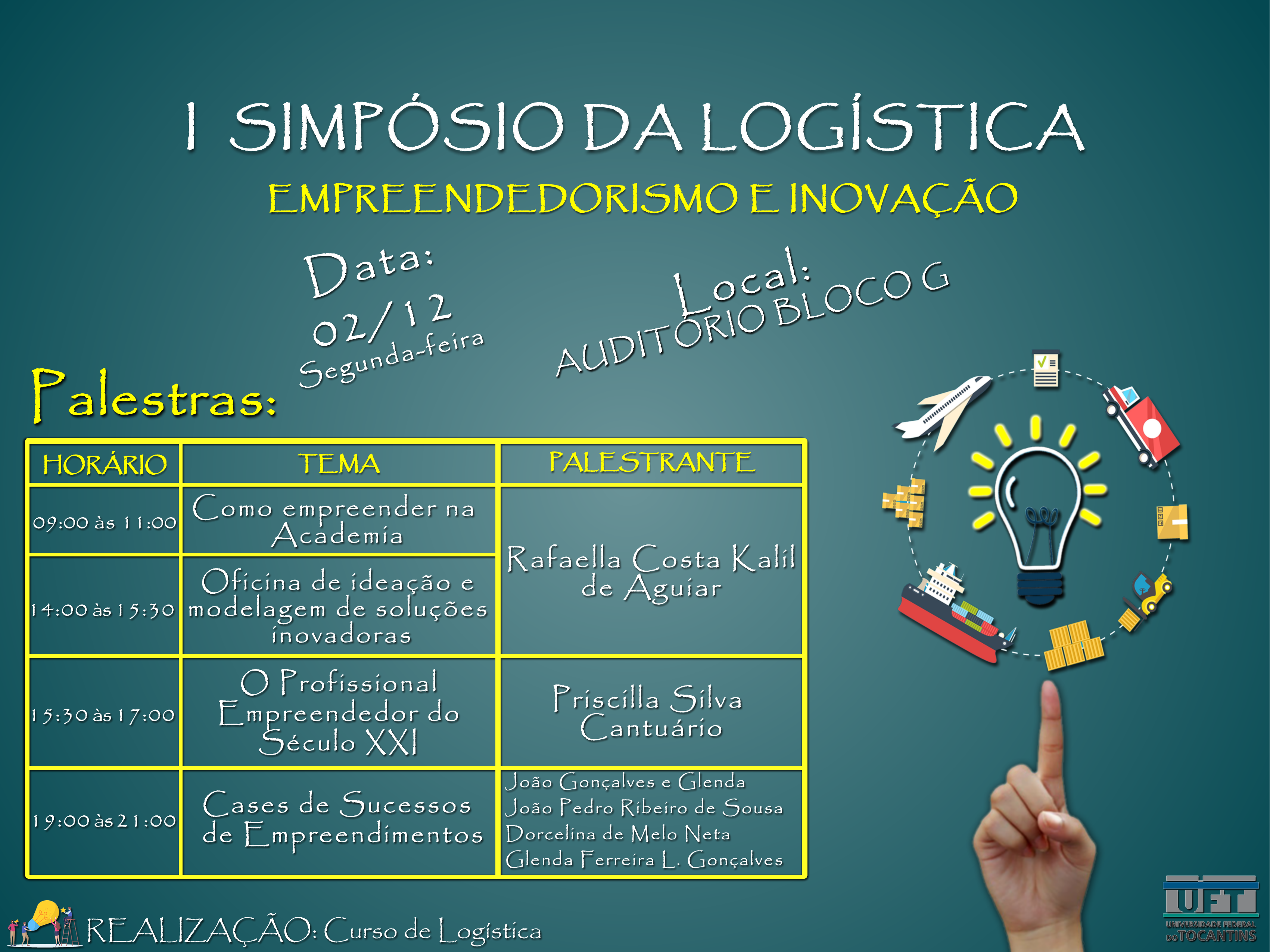 O objetivo é contribuir com a formação do Tecnólogo em Logística, destacando as práticas de Empreendedorismo e Inovação. “Tais temas são considerados como demandas atuais e futuras da sociedade, promovendo a integração de saberes interdisciplinares entre docentes, discentes e egressos do Curso de Logística da UFT”, destaca os organizadores do evento.