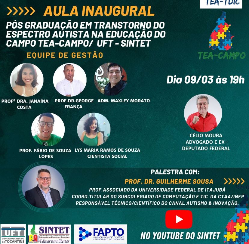 Ocorre hoje (09), às 19h, a aula inaugural do curso de Especialização em Transtorno do Espectro Autista na Educação do Campo (TEA-Campo), com palestra do Prof. Dr. Guilherme Sousa (Universidade Federal de Itajubá - Unifei). O evento será transmitido pelo canal no Youtube do Sintet Tocantins.