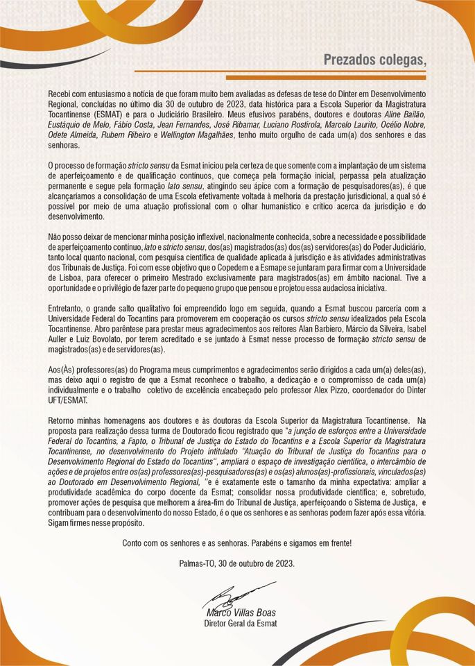 Ao final dessa parceria, o coordenador do PPGDR tem muito a agradecer: “Agradecemos ao nosso Reitor Bovolato pelo apoio dado e sua visão que a universidade sempre deve atender aos anseios da sociedade. Agradecemos ao desembargador Marco Villas Boas por sua visão estratégica em prol da valorização da formação em alto nível e o desenvolvimento de ações que estão efetivamente contribuindo para a melhoria das instituições que estão no estado do Tocantins.
