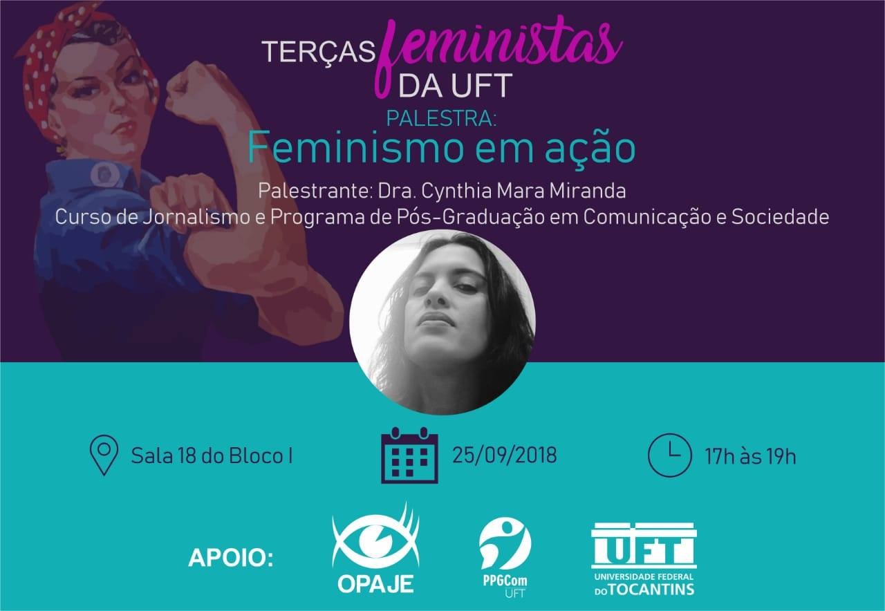 Terças feministas(Foto/Divulgação)O projeto Terças Feministas prossegue com seus encontros semanais. O tema que será discutido nesta terça abordará "Feminismo em ação". O encontro será no Bloco I sala 18 das 17h às 19h. A roda de conversa será ministrada pela professora Cynthia Mara Miranda, que integra o programa de Pós-graduação em Comunicação e Sociedade, também é docente do curso de Jornalismo.