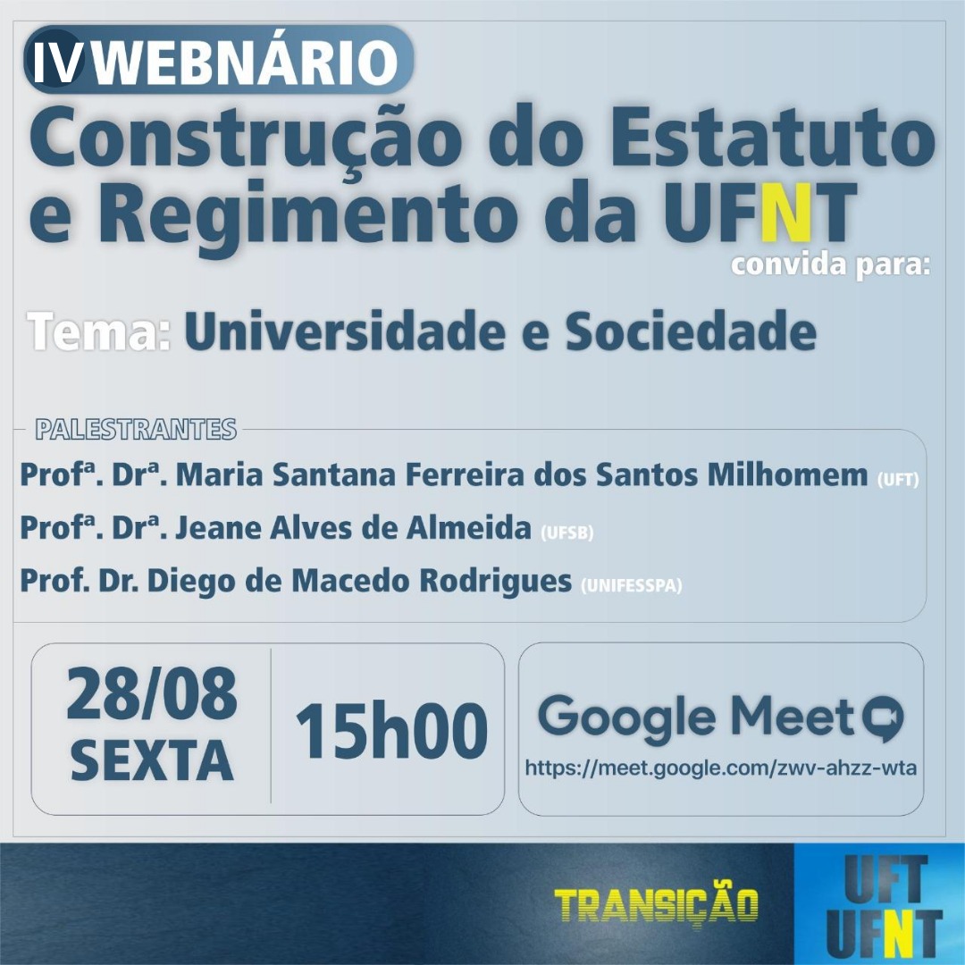 Continuando a série de webnários organizados pela Comissão de Sistematização do Estatuto e Regimento (CSE), que integra a Comissão Central de Transição UFT/UFNT, ocorre nessa sexta-feira, 28, às 15h, via Google Meet, o IV Webnário sobre a Construção do Estatuto e Regimento da UFNT, com o tema “Universidade e Sociedade”. O link para o evento é meet.google.com/zwv-ahzz-wta